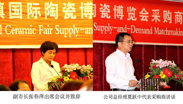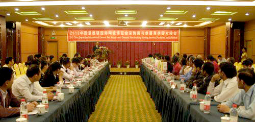 10月18日下午,由瓷博會(huì)、省陶瓷公司主辦的“2012年中國(guó)景德鎮(zhèn)國(guó)際陶瓷博覽會(huì)采購(gòu)商與參展企業(yè)對(duì)接會(huì)”在開(kāi)門(mén)子三樓會(huì)議室舉行。來(lái)自10余個(gè)國(guó)家的40家采購(gòu)商以及由瓷博會(huì)根據(jù)采購(gòu)需求挑選出來(lái)的55家參展商參加了此次對(duì)接會(huì)議。副市長(zhǎng)張春萍出席會(huì)議并致辭。