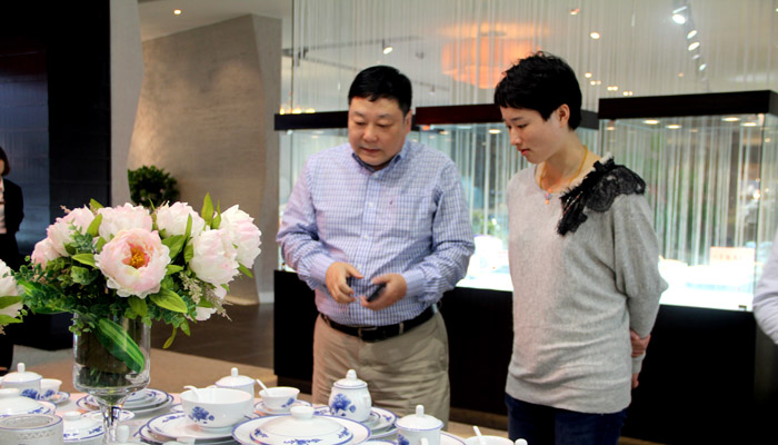 公司董事長(zhǎng)王耀在給吳靜鈺介紹中南海二代瓷