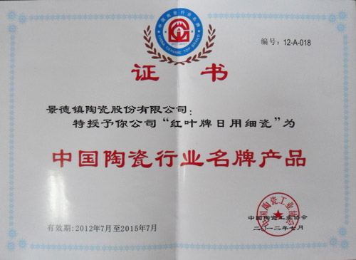 中國(guó)陶瓷工業(yè)協(xié)會(huì)于今年2月份開(kāi)展了第五批中國(guó)陶瓷行業(yè)名牌產(chǎn)品的推薦評(píng)審及復(fù)評(píng)工作。經(jīng)過(guò)企業(yè)自愿申請(qǐng)、資料審查、專家評(píng)審、組委會(huì)領(lǐng)導(dǎo)小組審查、公示等一系列細(xì)致的工作,最終評(píng)選出了2012年“中國(guó)陶瓷行業(yè)名牌產(chǎn)品”。公司生產(chǎn)的“紅葉”牌日用陶瓷再次被評(píng)為“中國(guó)陶瓷行業(yè)名牌產(chǎn)品”。
