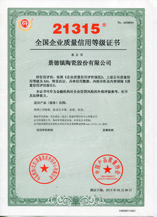 據(jù)了解,榮獲《中國(guó)21315質(zhì)量信用等級(jí)AAA級(jí)證書》的企業(yè)可在網(wǎng)站系統(tǒng)上進(jìn)行查詢。質(zhì)量信用等級(jí)從AAA到D共有10個(gè)級(jí)別,AAA級(jí)是質(zhì)量信用等級(jí)的最高級(jí)別,意思是產(chǎn)品質(zhì)量信用“非常好”。