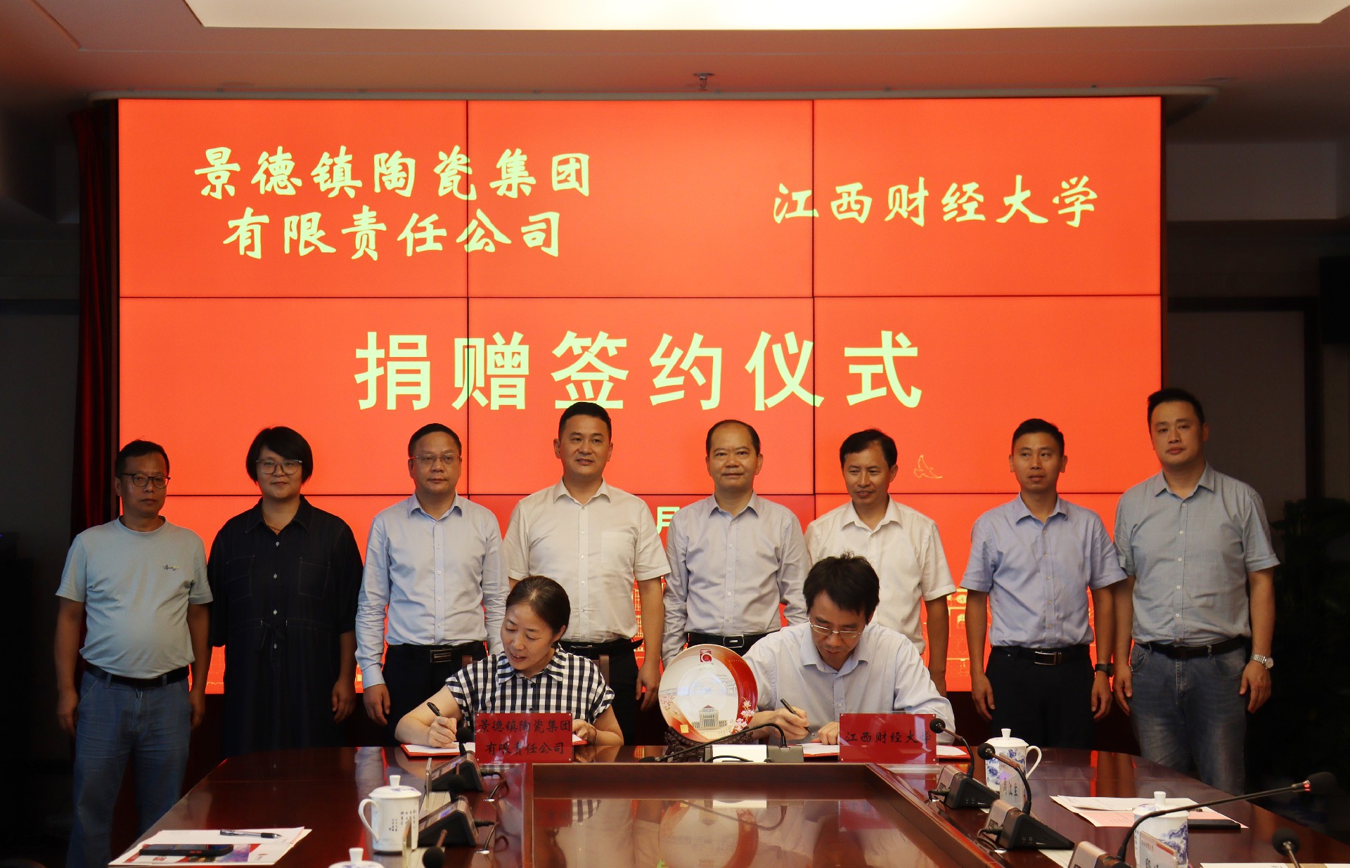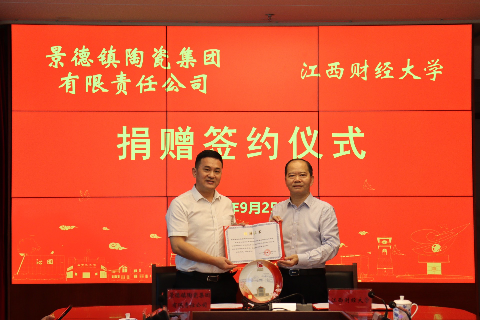 簽約儀式上,吳愛云代表景陶集團(tuán)與江西財(cái)經(jīng)大學(xué)簽署捐贈(zèng)協(xié)議,并捐贈(zèng)紀(jì)念瓷盤,鄧景揚(yáng)代表景陶集團(tuán)接受江西財(cái)大頒發(fā)的《捐贈(zèng)證書》。